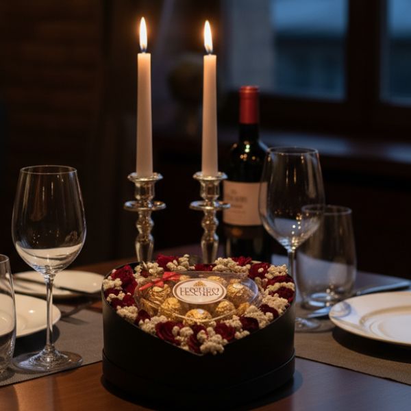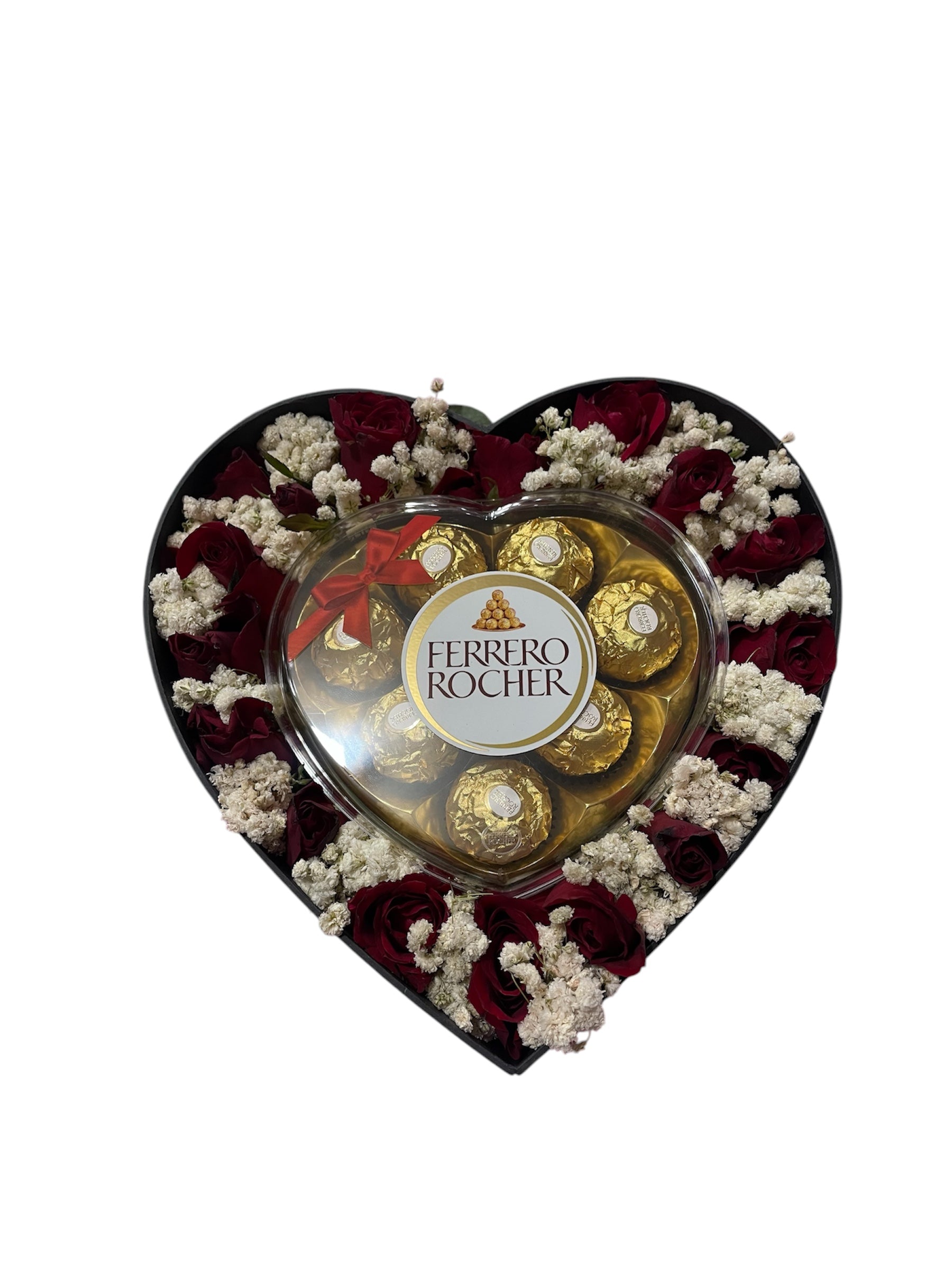 Box circumference : 12 inches Contents : Heart shaped Ferrero Chocolates 8's, fresh Red Roses with white imported accents. NOTE:... Read more