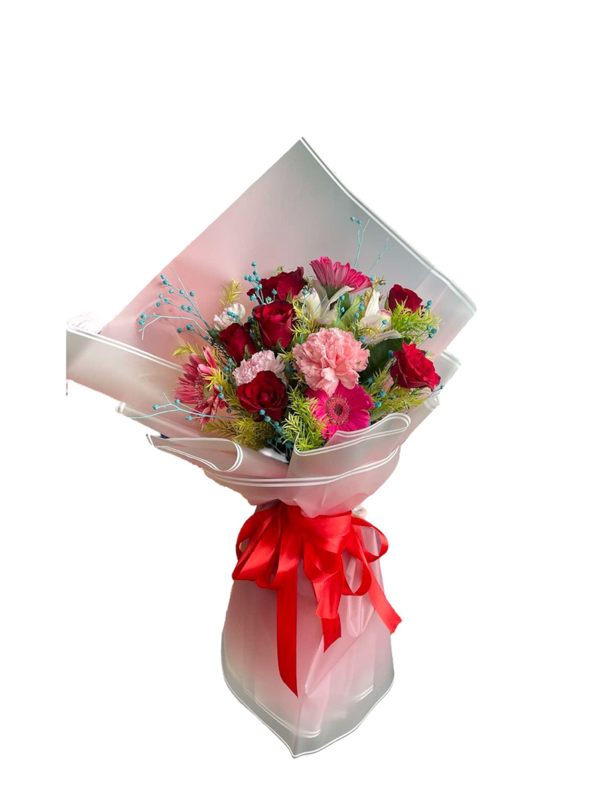 Six (6) stems Red Roses + Three (3) stems Gerbera daisy + Carnation Pink + Lily White. NOTE: This is... Read more