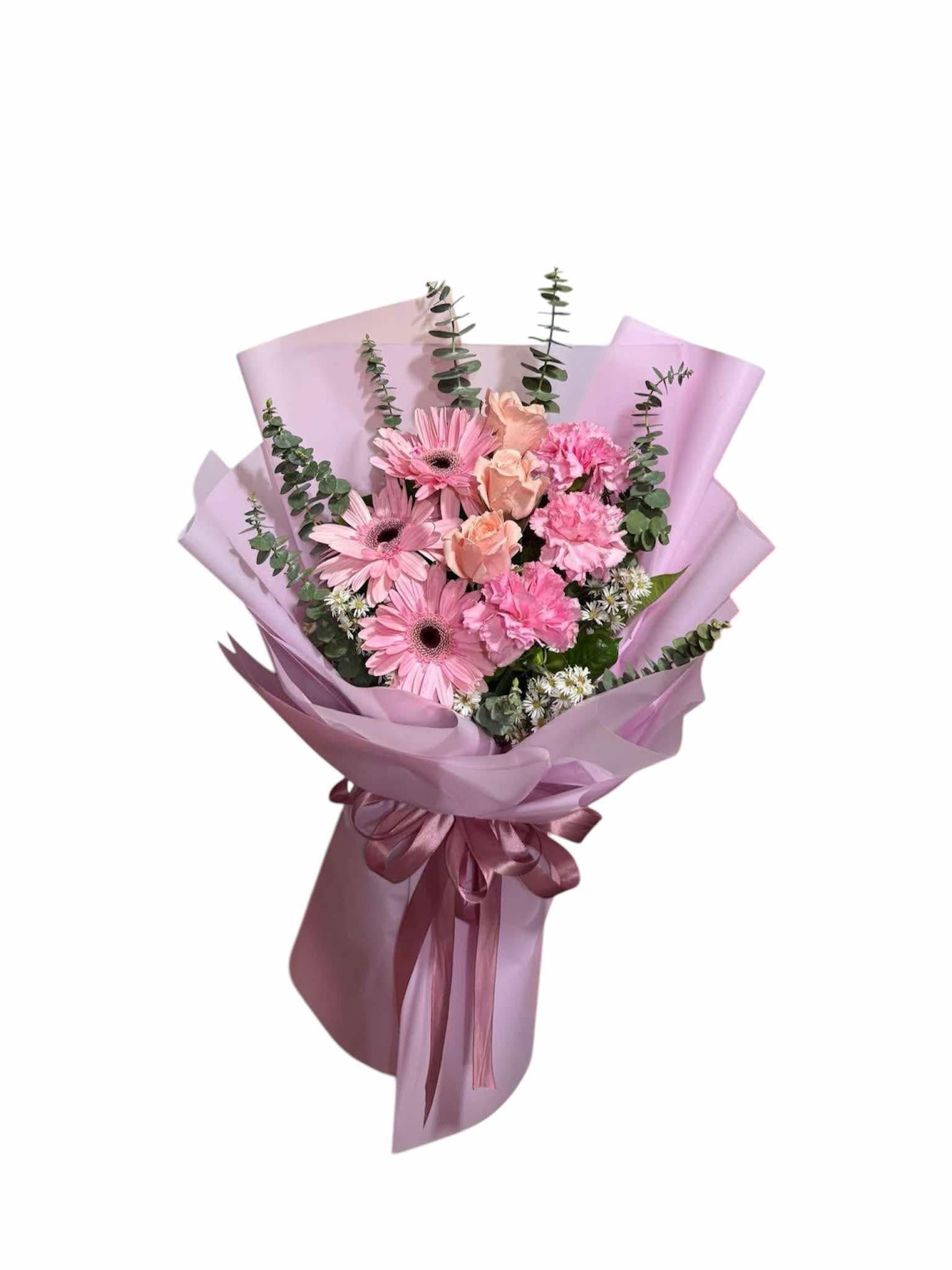 This bouquet consists : Mix of (3) pink Gerberas + (3) pink Roses + (3) pink Carnation. This is Large... Read more