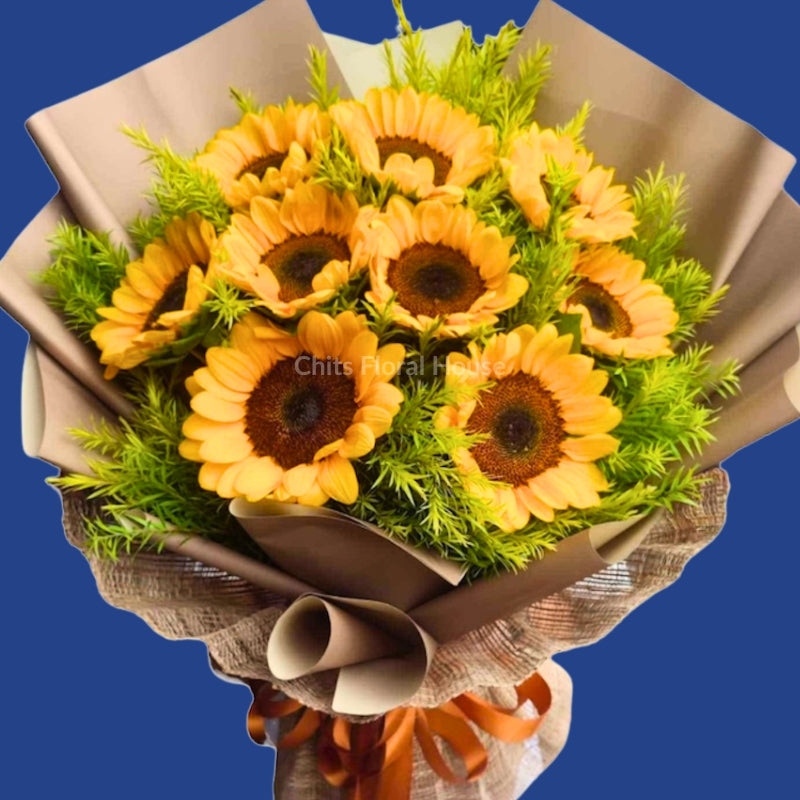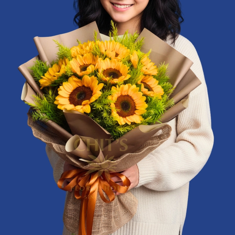 Golden Harvest BouquetRadiate happiness and positivity with our Golden Harvest Bouquet, featuring ten (10) vibrant sunflowers paired with lush green... Read more